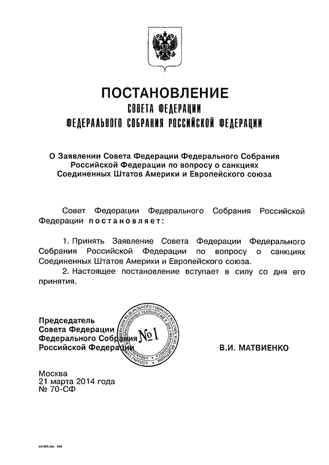 "О ЗАЯВЛЕНИИ СОВЕТА ФЕДЕРАЦИИ ФЕДЕРАЛЬНОГО СОБРАНИЯ РОССИЙСКОЙ ФЕДЕРАЦИИ ПО ВОПРОСУ О САНКЦИЯХ СОЕДИНЕННЫХ ШТАТОВ АМЕРИКИ И ЕВРОПЕЙСКОГО СОЮЗА"
