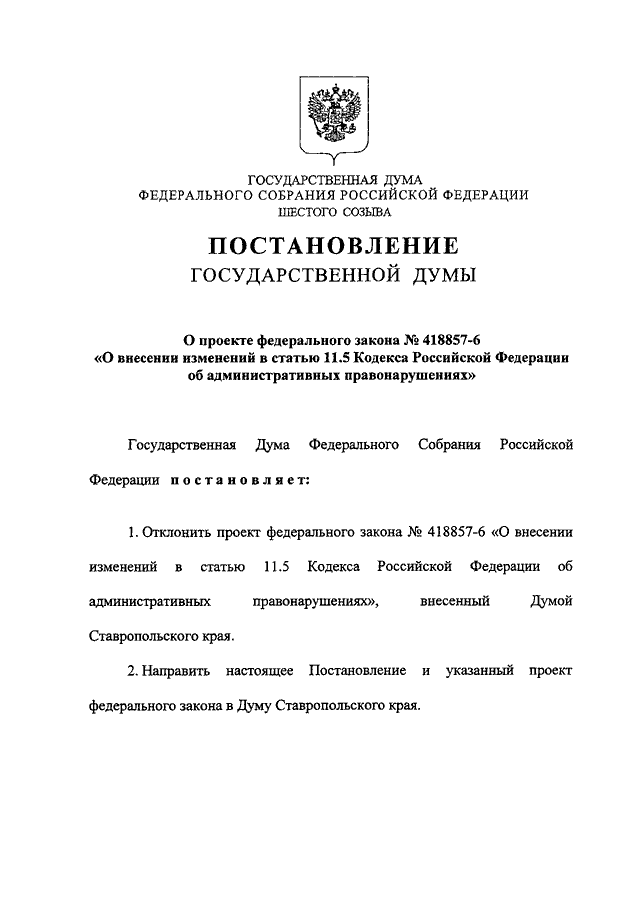 "О ПРОЕКТЕ ФЕДЕРАЛЬНОГО ЗАКОНА N 418857-6 "О ВНЕСЕНИИ ИЗМЕНЕНИЙ В СТАТЬЮ 11.5 КОДЕКСА РОССИЙСКОЙ ФЕДЕРАЦИИ ОБ АДМИНИСТРАТИВНЫХ ПРАВОНАРУШЕНИЯХ"