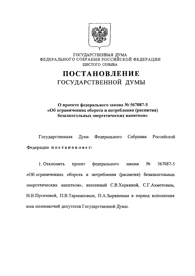 "О ПРОЕКТЕ ФЕДЕРАЛЬНОГО ЗАКОНА N 567087-5 "ОБ ОГРАНИЧЕНИЯХ ОБОРОТА И ПОТРЕБЛЕНИЯ (РАСПИТИЯ) БЕЗАЛКОГОЛЬНЫХ ЭНЕРГЕТИЧЕСКИХ НАПИТКОВ"