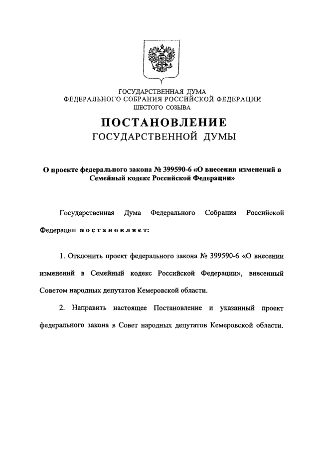 "О ПРОЕКТЕ ФЕДЕРАЛЬНОГО ЗАКОНА N 399590-6 "О ВНЕСЕНИИ ИЗМЕНЕНИЙ В СЕМЕЙНЫЙ КОДЕКС РОССИЙСКОЙ ФЕДЕРАЦИИ"