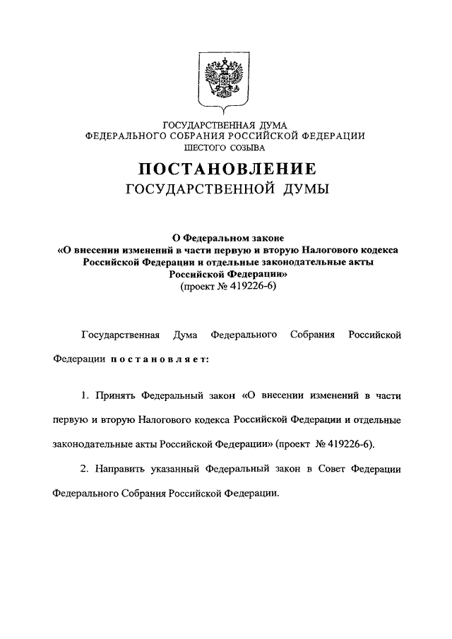 "О ФЕДЕРАЛЬНОМ ЗАКОНЕ "О ВНЕСЕНИИ ИЗМЕНЕНИЙ В ЧАСТИ ПЕРВУЮ И ВТОРУЮ НАЛОГОВОГО КОДЕКСА РОССИЙСКОЙ ФЕДЕРАЦИИ И ОТДЕЛЬНЫЕ ЗАКОНОДАТЕЛЬНЫЕ АКТЫ РОССИЙСКОЙ ФЕДЕРАЦИИ" (ПРОЕКТ N 419226-6)"