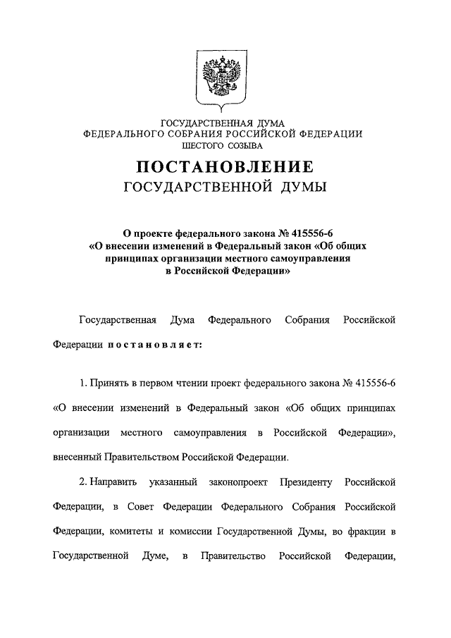 "О ПРОЕКТЕ ФЕДЕРАЛЬНОГО ЗАКОНА N 415556-6 "О ВНЕСЕНИИ ИЗМЕНЕНИЙ В ФЕДЕРАЛЬНЫЙ ЗАКОН "ОБ ОБЩИХ ПРИНЦИПАХ ОРГАНИЗАЦИИ МЕСТНОГО САМОУПРАВЛЕНИЯ В РОССИЙСКОЙ ФЕДЕРАЦИИ"