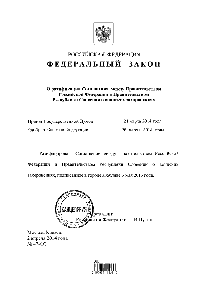 "О РАТИФИКАЦИИ СОГЛАШЕНИЯ МЕЖДУ ПРАВИТЕЛЬСТВОМ РОССИЙСКОЙ ФЕДЕРАЦИИ И ПРАВИТЕЛЬСТВОМ РЕСПУБЛИКИ СЛОВЕНИИ О ВОИНСКИХ ЗАХОРОНЕНИЯХ"