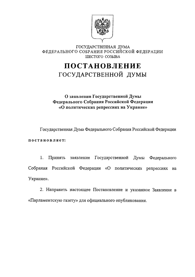 "О ЗАЯВЛЕНИИ ГОСУДАРСТВЕННОЙ ДУМЫ ФЕДЕРАЛЬНОГО СОБРАНИЯ РОССИЙСКОЙ ФЕДЕРАЦИИ "О ПОЛИТИЧЕСКИХ РЕПРЕССИЯХ НА УКРАИНЕ"