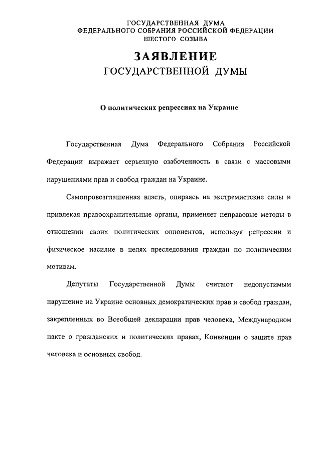 "О ЗАЯВЛЕНИИ ГОСУДАРСТВЕННОЙ ДУМЫ ФЕДЕРАЛЬНОГО СОБРАНИЯ РОССИЙСКОЙ ФЕДЕРАЦИИ "О ПОЛИТИЧЕСКИХ РЕПРЕССИЯХ НА УКРАИНЕ"
