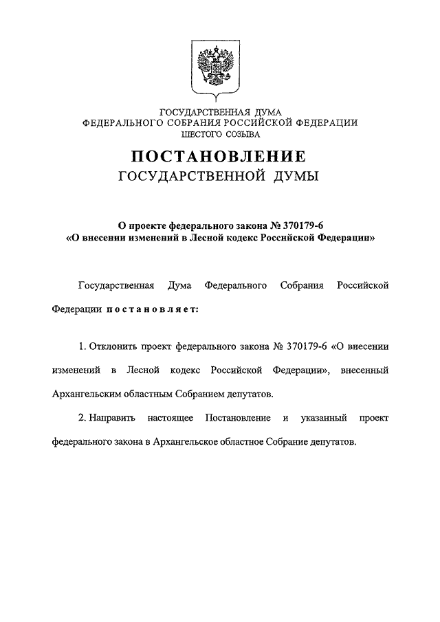 "О ПРОЕКТЕ ФЕДЕРАЛЬНОГО ЗАКОНА N 370179-6 "О ВНЕСЕНИИ ИЗМЕНЕНИЙ В ЛЕСНОЙ КОДЕКС РОССИЙСКОЙ ФЕДЕРАЦИИ"