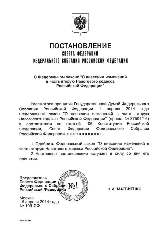 ПОСТАНОВЛЕНИЕ СФ ФС РФ от 16.04.2014 N 109-СФ