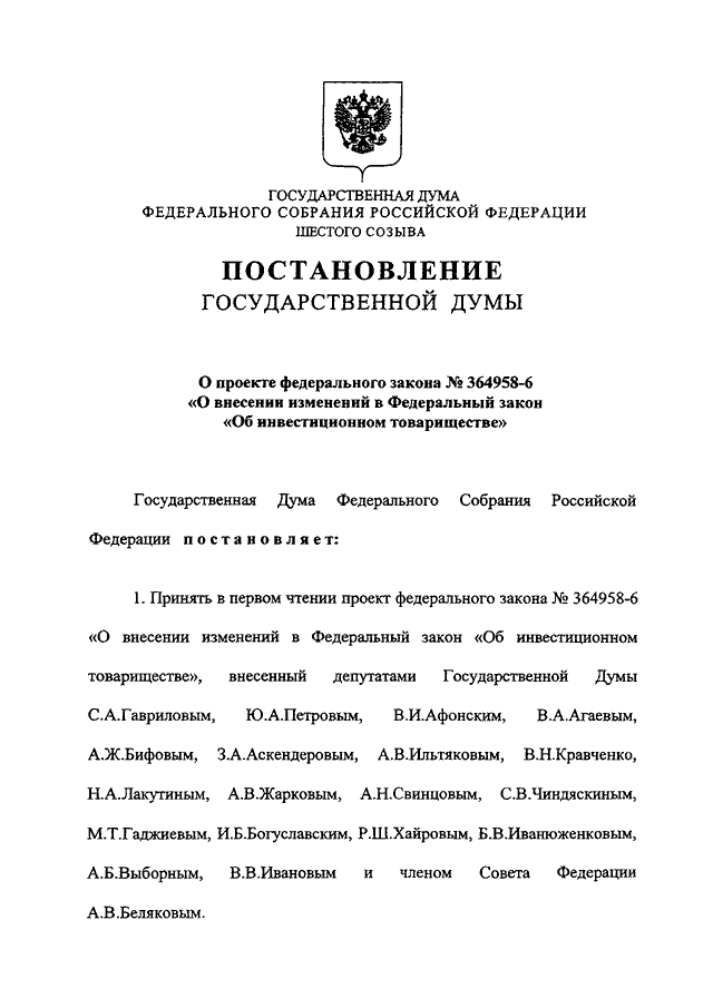 "О ПРОЕКТЕ ФЕДЕРАЛЬНОГО ЗАКОНА N 364958-6 "О ВНЕСЕНИИ ИЗМЕНЕНИЙ В ФЕДЕРАЛЬНЫЙ ЗАКОН "ОБ ИНВЕСТИЦИОННОМ ТОВАРИЩЕСТВЕ"