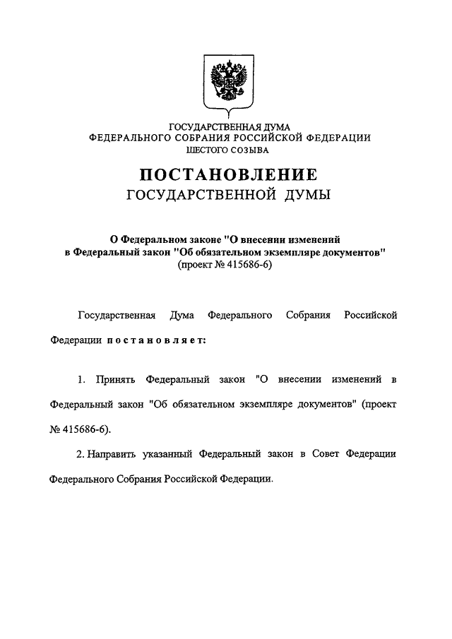 "О ФЕДЕРАЛЬНОМ ЗАКОНЕ "О ВНЕСЕНИИ ИЗМЕНЕНИЙ В ФЕДЕРАЛЬНЫЙ ЗАКОН "ОБ ОБЯЗАТЕЛЬНОМ ЭКЗЕМПЛЯРЕ ДОКУМЕНТОВ" (ПРОЕКТ N 415686-6)"