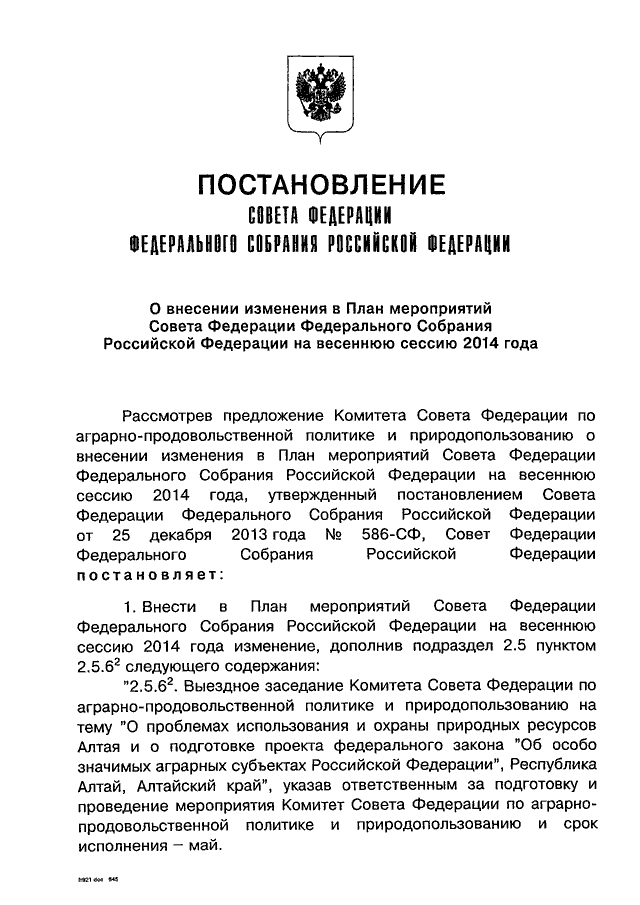 "О ВНЕСЕНИИ ИЗМЕНЕНИЯ В ПЛАН МЕРОПРИЯТИЙ СОВЕТА ФЕДЕРАЦИИ ФЕДЕРАЛЬНОГО СОБРАНИЯ РОССИЙСКОЙ ФЕДЕРАЦИИ НА ВЕСЕННЮЮ СЕССИЮ 2014 ГОДА"
