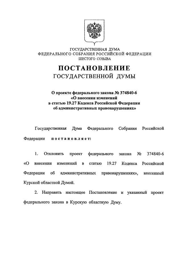 "О ПРОЕКТЕ ФЕДЕРАЛЬНОГО ЗАКОНА N 374840-6 "О ВНЕСЕНИИ ИЗМЕНЕНИЙ В СТАТЬЮ 19.27 КОДЕКСА РОССИЙСКОЙ ФЕДЕРАЦИИ ОБ АДМИНИСТРАТИВНЫХ ПРАВОНАРУШЕНИЯХ"