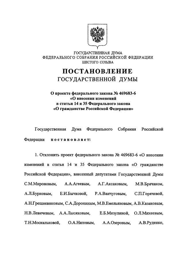 "О ПРОЕКТЕ ФЕДЕРАЛЬНОГО ЗАКОНА N 469683-6 "О ВНЕСЕНИИ ИЗМЕНЕНИЙ В СТАТЬИ 14 И 35 ФЕДЕРАЛЬНОГО ЗАКОНА "О ГРАЖДАНСТВЕ РОССИЙСКОЙ ФЕДЕРАЦИИ"