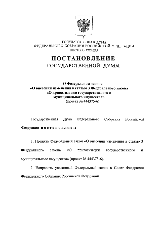 "О ФЕДЕРАЛЬНОМ ЗАКОНЕ "О ВНЕСЕНИИ ИЗМЕНЕНИЯ В СТАТЬЮ 3 ФЕДЕРАЛЬНОГО ЗАКОНА "О ПРИВАТИЗАЦИИ ГОСУДАРСТВЕННОГО И МУНИЦИПАЛЬНОГО ИМУЩЕСТВА" (ПРОЕКТ N 444375-6)"