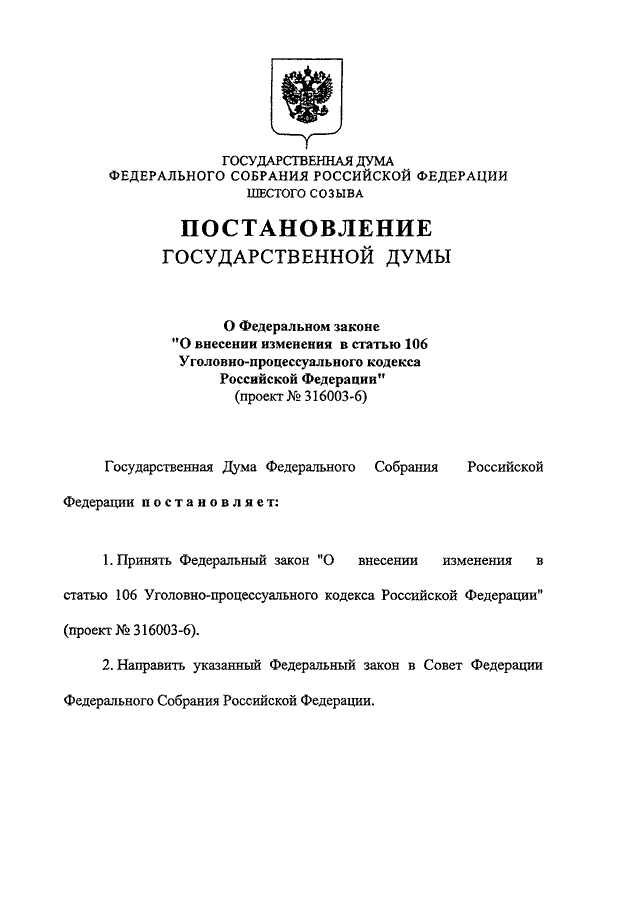"О ФЕДЕРАЛЬНОМ ЗАКОНЕ "О ВНЕСЕНИИ ИЗМЕНЕНИЯ В СТАТЬЮ 106 УГОЛОВНО - ПРОЦЕССУАЛЬНОГО КОДЕКСА РОССИЙСКОЙ ФЕДЕРАЦИИ" (ПРОЕКТ N 316003-6)"