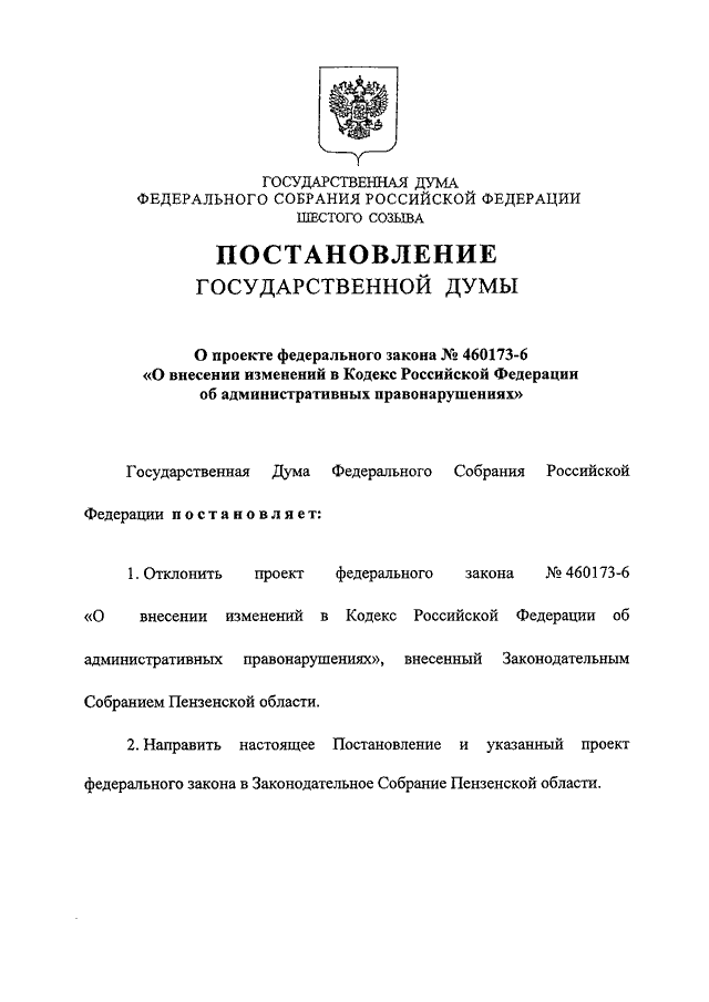 "О ПРОЕКТЕ ФЕДЕРАЛЬНОГО ЗАКОНА N 460173-6 "О ВНЕСЕНИИ ИЗМЕНЕНИЙ В КОДЕКС РОССИЙСКОЙ ФЕДЕРАЦИИ ОБ АДМИНИСТРАТИВНЫХ ПРАВОНАРУШЕНИЯХ"