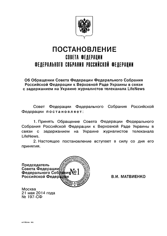 "ОБ ОБРАЩЕНИИ СОВЕТА ФЕДЕРАЦИИ ФЕДЕРАЛЬНОГО СОБРАНИЯ РОССИЙСКОЙ ФЕДЕРАЦИИ К ВЕРХОВНОЙ РАДЕ УКРАИНЫ В СВЯЗИ С ЗАДЕРЖАНИЕМ НА УКРАИНЕ ЖУРНАЛИСТОВ ТЕЛЕКАНАЛА LIFENEWS"