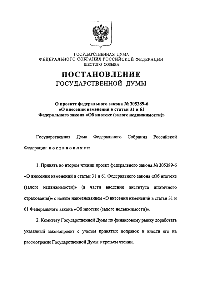"О ПРОЕКТЕ ФЕДЕРАЛЬНОГО ЗАКОНА N 305389-6 "О ВНЕСЕНИИ ИЗМЕНЕНИЙ В СТАТЬИ 31 И 61 ФЕДЕРАЛЬНОГО ЗАКОНА "ОБ ИПОТЕКЕ (ЗАЛОГЕ НЕДВИЖИМОСТИ)"