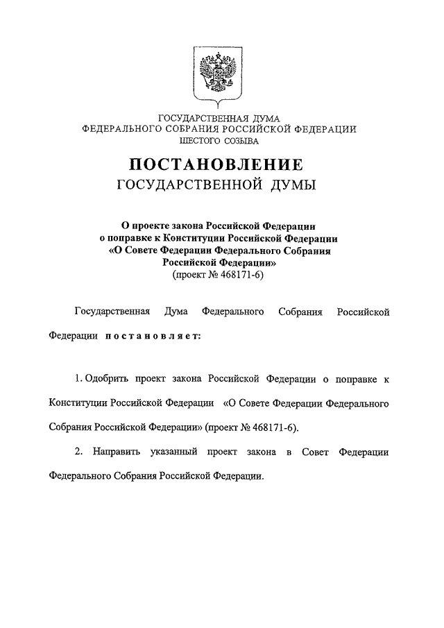 "О ПРОЕКТЕ ЗАКОНА РОССИЙСКОЙ ФЕДЕРАЦИИ О ПОПРАВКЕ К КОНСТИТУЦИИ РОССИЙСКОЙ ФЕДЕРАЦИИ "О СОВЕТЕ ФЕДЕРАЦИИ ФЕДЕРАЛЬНОГО СОБРАНИЯ РОССИЙСКОЙ ФЕДЕРАЦИИ" (ПРОЕКТ N 468171-6)"
