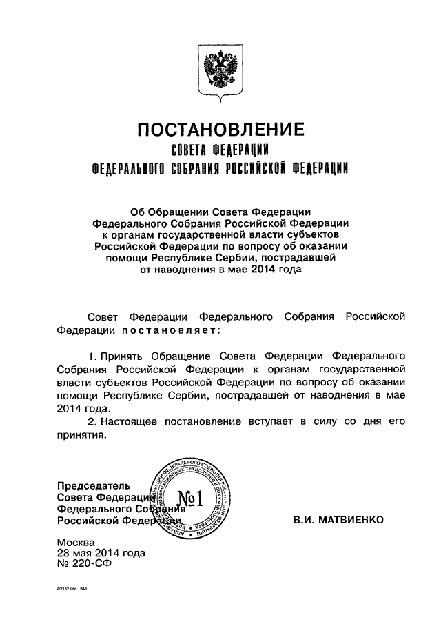 "ОБ ОБРАЩЕНИИ СОВЕТА ФЕДЕРАЦИИ ФЕДЕРАЛЬНОГО СОБРАНИЯ РОССИЙСКОЙ ФЕДЕРАЦИИ К ОРГАНАМ ГОСУДАРСТВЕННОЙ ВЛАСТИ СУБЪЕКТОВ РОССИЙСКОЙ ФЕДЕРАЦИИ ПО ВОПРОСУ ОБ ОКАЗАНИИ ПОМОЩИ РЕСПУБЛИКЕ СЕРБИИ, ПОСТРАДАВШЕЙ ОТ НАВОДНЕНИЯ В МАЕ 2014 ГОДА"