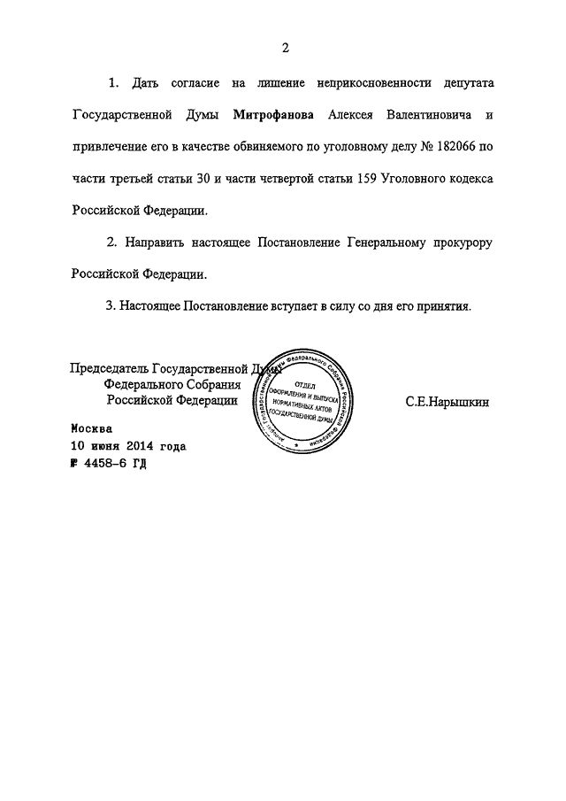 "О ДАЧЕ СОГЛАСИЯ НА ЛИШЕНИЕ НЕПРИКОСНОВЕННОСТИ ДЕПУТАТА ГОСУДАРСТВЕННОЙ ДУМЫ ФЕДЕРАЛЬНОГО СОБРАНИЯ РОССИЙСКОЙ ФЕДЕРАЦИИ МИТРОФАНОВА АЛЕКСЕЯ ВАЛЕНТИНОВИЧА И ПРИВЛЕЧЕНИЕ ЕГО В КАЧЕСТВЕ ОБВИНЯЕМОГО"