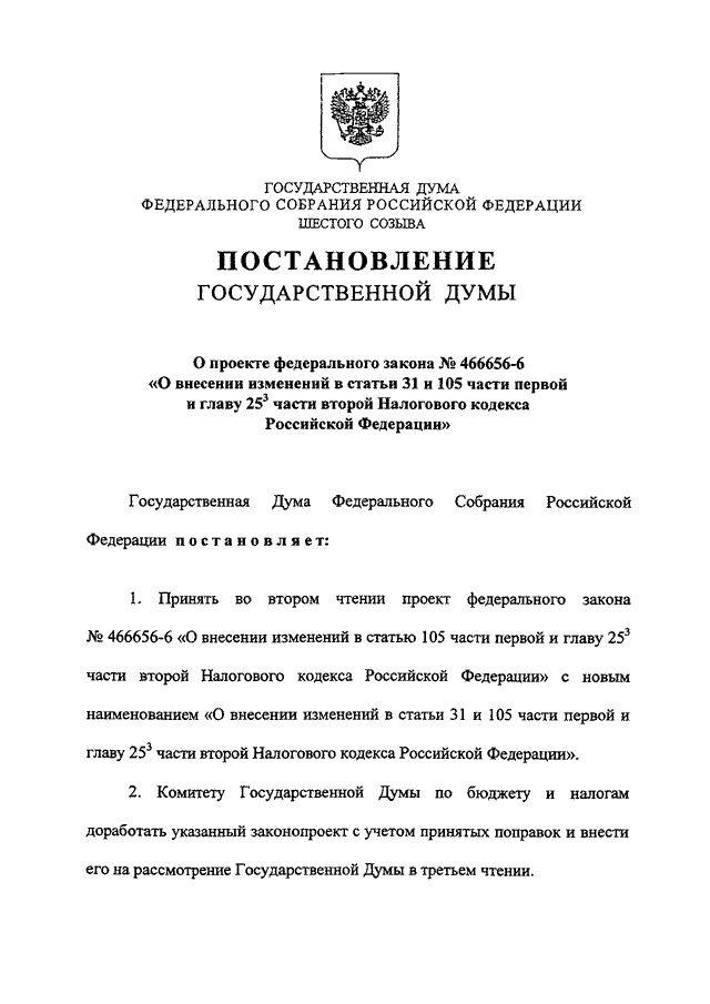 "О ПРОЕКТЕ ФЕДЕРАЛЬНОГО ЗАКОНА N 466656-6 "О ВНЕСЕНИИ ИЗМЕНЕНИЙ В СТАТЬИ 31 И 105 ЧАСТИ ПЕРВОЙ И ГЛАВУ 25.3 ЧАСТИ ВТОРОЙ НАЛОГОВОГО КОДЕКСА РОССИЙСКОЙ ФЕДЕРАЦИИ"