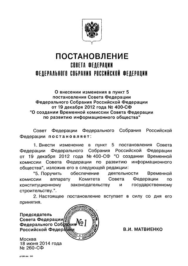 ПОСТАНОВЛЕНИЕ СФ ФС РФ от 18.06.2014 N 260-СФ