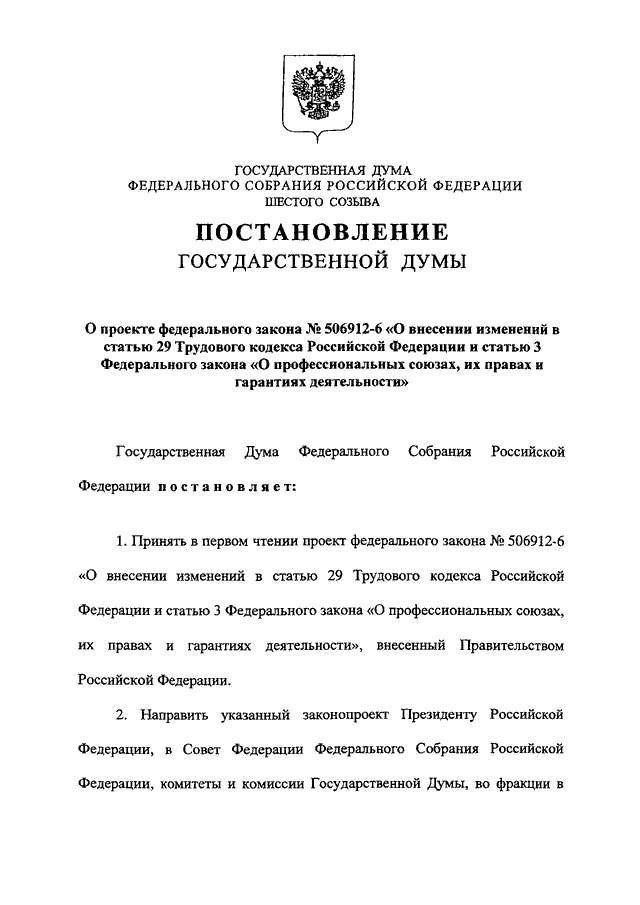 "О ПРОЕКТЕ ФЕДЕРАЛЬНОГО ЗАКОНА N 506912-6 "О ВНЕСЕНИИ ИЗМЕНЕНИЙ В СТАТЬЮ 29 ТРУДОВОГО КОДЕКСА РОССИЙСКОЙ ФЕДЕРАЦИИ И СТАТЬЮ 3 ФЕДЕРАЛЬНОГО ЗАКОНА "О ПРОФЕССИОНАЛЬНЫХ СОЮЗАХ, ИХ ПРАВАХ И ГАРАНТИЯХ ДЕЯТЕЛЬНОСТИ"
