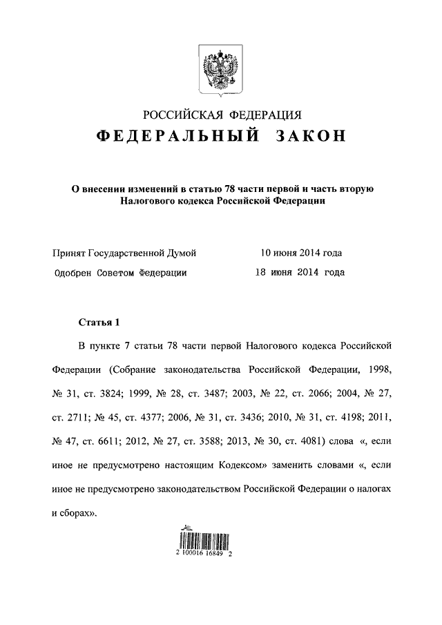 "О ВНЕСЕНИИ ИЗМЕНЕНИЙ В СТАТЬЮ 78 ЧАСТИ ПЕРВОЙ И ЧАСТЬ ВТОРУЮ НАЛОГОВОГО КОДЕКСА РОССИЙСКОЙ ФЕДЕРАЦИИ"