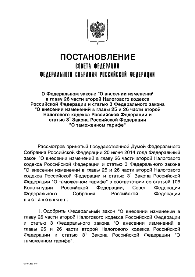 ФЕДЕРАЛЬНОГО ЗАКОНА "О ВНЕСЕНИИ ИЗМЕНЕНИЙ В ГЛАВЫ 25 И 26 ЧАСТИ