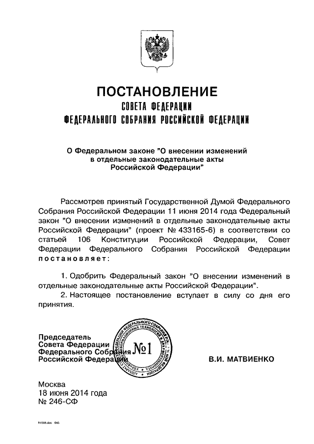 ПОСТАНОВЛЕНИЕ СФ ФС РФ от 18.06.2014 N 246-СФ