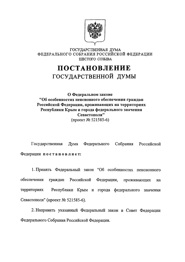 "О ФЕДЕРАЛЬНОМ ЗАКОНЕ "ОБ ОСОБЕННОСТЯХ ПЕНСИОННОГО ОБЕСПЕЧЕНИЯ ГРАЖДАН РОССИЙСКОЙ ФЕДЕРАЦИИ, ПРОЖИВАЮЩИХ НА ТЕРРИТОРИЯХ РЕСПУБЛИКИ КРЫМ И ГОРОДА ФЕДЕРАЛЬНОГО ЗНАЧЕНИЯ СЕВАСТОПОЛЯ" (ПРОЕКТ N 521585-6)"