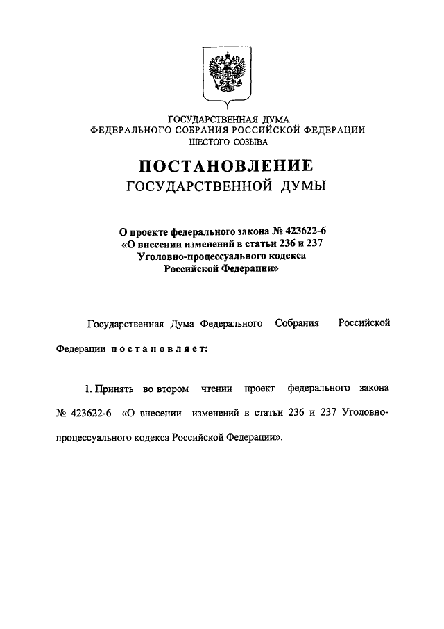 "О ПРОЕКТЕ ФЕДЕРАЛЬНОГО ЗАКОНА N 423622-6 "О ВНЕСЕНИИ ИЗМЕНЕНИЙ В СТАТЬИ 236 И 237 УГОЛОВНО - ПРОЦЕССУАЛЬНОГО КОДЕКСА РОССИЙСКОЙ ФЕДЕРАЦИИ"