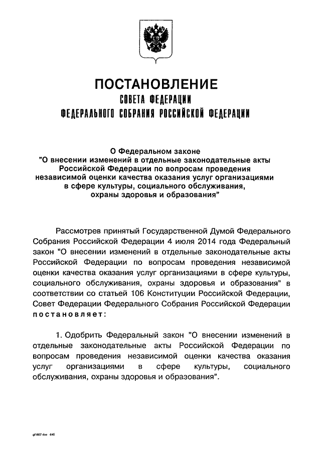 "О ФЕДЕРАЛЬНОМ ЗАКОНЕ "О ВНЕСЕНИИ ИЗМЕНЕНИЙ В ОТДЕЛЬНЫЕ ЗАКОНОДАТЕЛЬНЫЕ АКТЫ РОССИЙСКОЙ ФЕДЕРАЦИИ ПО ВОПРОСАМ ПРОВЕДЕНИЯ НЕЗАВИСИМОЙ ОЦЕНКИ КАЧЕСТВА ОКАЗАНИЯ УСЛУГ ОРГАНИЗАЦИЯМИ В СФЕРЕ КУЛЬТУРЫ, СОЦИАЛЬНОГО ОБСЛУЖИВАНИЯ, ОХРАНЫ ЗДОРОВЬЯ И ОБРАЗОВАНИЯ"
