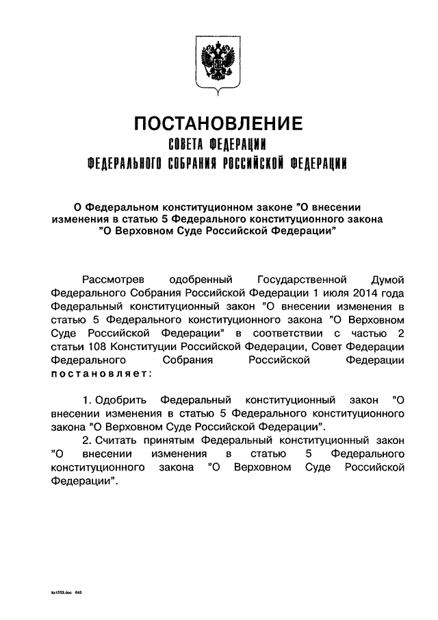 "О ФЕДЕРАЛЬНОМ КОНСТИТУЦИОННОМ ЗАКОНЕ "О ВНЕСЕНИИ ИЗМЕНЕНИЯ В СТАТЬЮ 5 ФЕДЕРАЛЬНОГО КОНСТИТУЦИОННОГО ЗАКОНА "О ВЕРХОВНОМ СУДЕ РОССИЙСКОЙ ФЕДЕРАЦИИ"