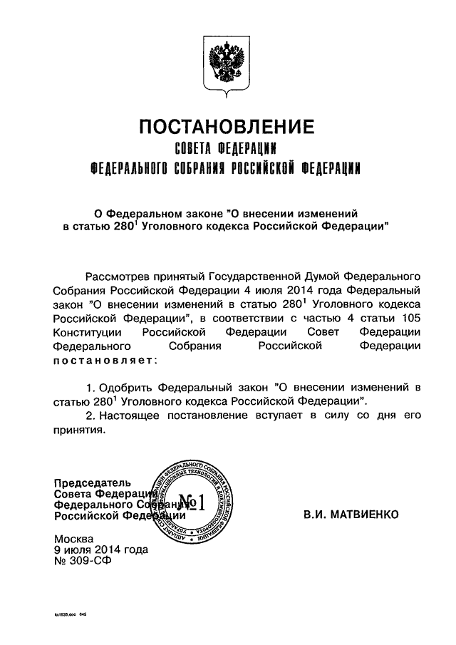 "О ФЕДЕРАЛЬНОМ ЗАКОНЕ "О ВНЕСЕНИИ ИЗМЕНЕНИЙ В СТАТЬЮ 280.1 УГОЛОВНОГО КОДЕКСА РОССИЙСКОЙ ФЕДЕРАЦИИ"