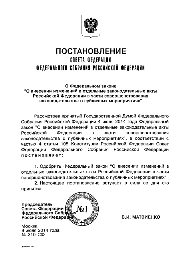 ПОСТАНОВЛЕНИЕ СФ ФС РФ от 09.07.2014 N 310-СФ