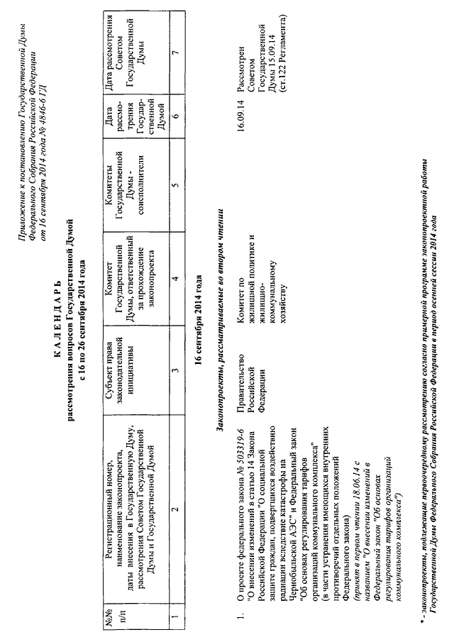 "О КАЛЕНДАРЕ РАССМОТРЕНИЯ ВОПРОСОВ ГОСУДАРСТВЕННОЙ ДУМОЙ С 16 ПО 26 СЕНТЯБРЯ 2014 ГОДА"