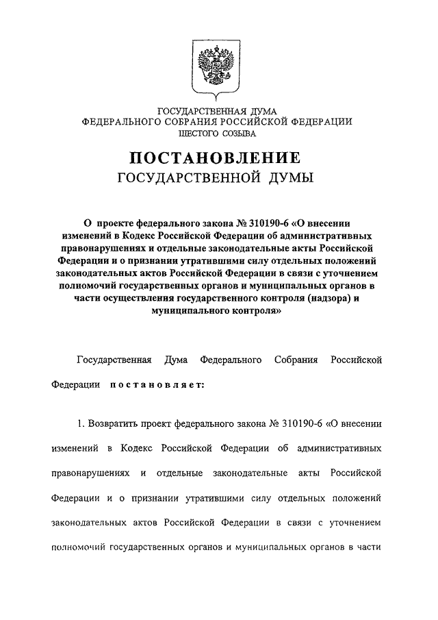 "О ПРОЕКТЕ ФЕДЕРАЛЬНОГО ЗАКОНА N 310190-6 "О ВНЕСЕНИИ ИЗМЕНЕНИЙ В