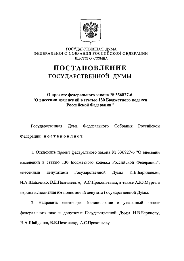 "О ПРОЕКТЕ ФЕДЕРАЛЬНОГО ЗАКОНА N 336827-6 "О ВНЕСЕНИИ ИЗМЕНЕНИЙ В СТАТЬЮ 130 БЮДЖЕТНОГО КОДЕКСА РОССИЙСКОЙ ФЕДЕРАЦИИ"