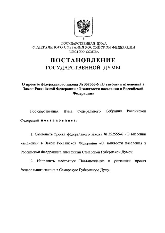 "О ПРОЕКТЕ ФЕДЕРАЛЬНОГО ЗАКОНА N 352555-6 "О ВНЕСЕНИИ ИЗМЕНЕНИЙ В ЗАКОН РОССИЙСКОЙ ФЕДЕРАЦИИ "О ЗАНЯТОСТИ НАСЕЛЕНИЯ В РОССИЙСКОЙ ФЕДЕРАЦИИ"