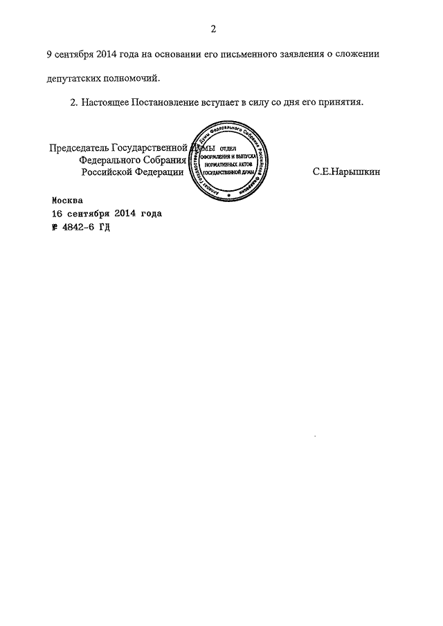 ПОСТАНОВЛЕНИЕ ГД ФС РФ от 16.09.2014 N 4842-6 ГД