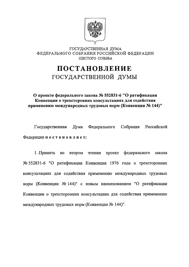 "О ПРОЕКТЕ ФЕДЕРАЛЬНОГО ЗАКОНА N 552831-6 "О РАТИФИКАЦИИ КОНВЕНЦИИ О ТРЕХСТОРОННИХ КОНСУЛЬТАЦИЯХ ДЛЯ СОДЕЙСТВИЯ ПРИМЕНЕНИЮ МЕЖДУНАРОДНЫХ ТРУДОВЫХ НОРМ (КОНВЕНЦИИ N 144)"