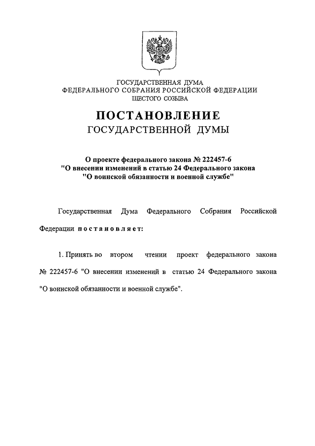 "О ПРОЕКТЕ ФЕДЕРАЛЬНОГО ЗАКОНА N 222457-6 "О ВНЕСЕНИИ ИЗМЕНЕНИЙ В СТАТЬЮ 24 ФЕДЕРАЛЬНОГО ЗАКОНА "О ВОИНСКОЙ ОБЯЗАННОСТИ И ВОЕННОЙ СЛУЖБЕ"