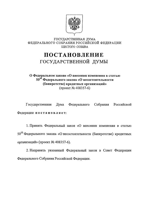 "О ФЕДЕРАЛЬНОМ ЗАКОНЕ "О ВНЕСЕНИИ ИЗМЕНЕНИЯ В СТАТЬЮ 50.30 ФЕДЕРАЛЬНОГО ЗАКОНА "О НЕСОСТОЯТЕЛЬНОСТИ (БАНКРОТСТВЕ) КРЕДИТНЫХ ОРГАНИЗАЦИЙ" (ПРОЕКТ N 408357-6)"