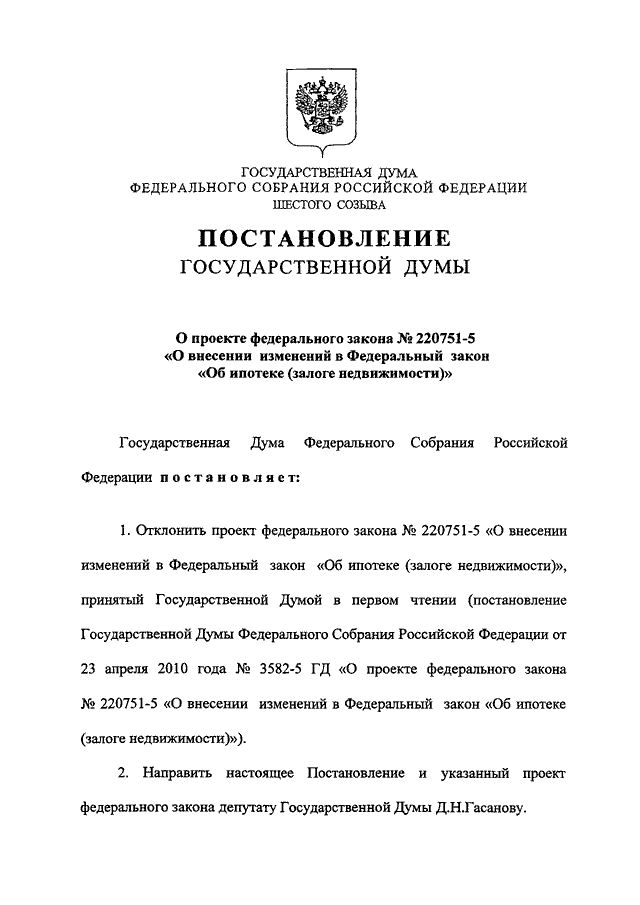 "О ПРОЕКТЕ ФЕДЕРАЛЬНОГО ЗАКОНА N 220751-5 "О ВНЕСЕНИИ ИЗМЕНЕНИЙ В ФЕДЕРАЛЬНЫЙ ЗАКОН "ОБ ИПОТЕКЕ (ЗАЛОГЕ НЕДВИЖИМОСТИ)"