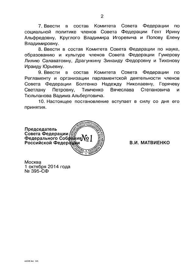 ПОСТАНОВЛЕНИЕ СФ ФС РФ от 01.10.2014 N 395-СФ