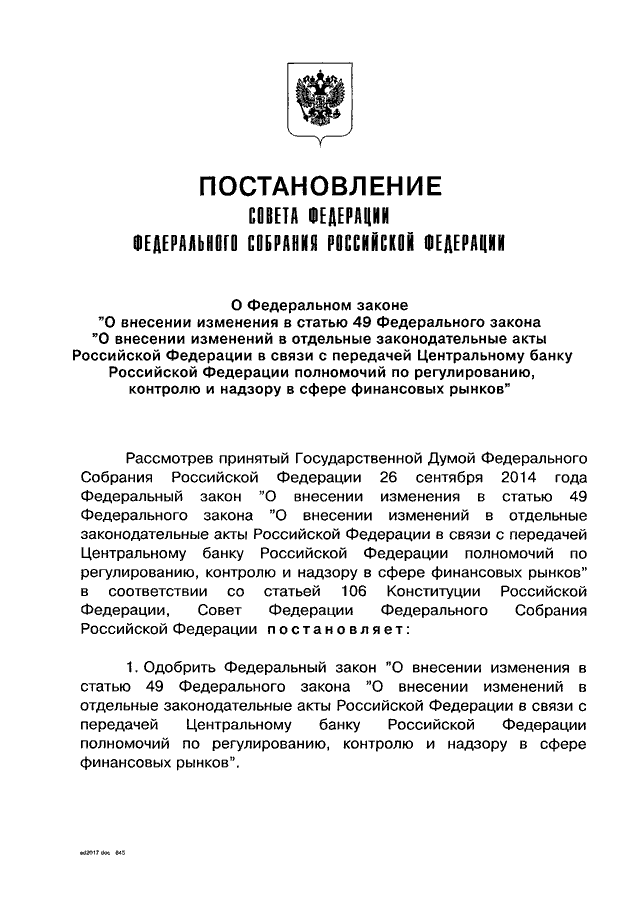 ПОСТАНОВЛЕНИЕ СФ ФС РФ от 01.10.2014 N 405-СФ
