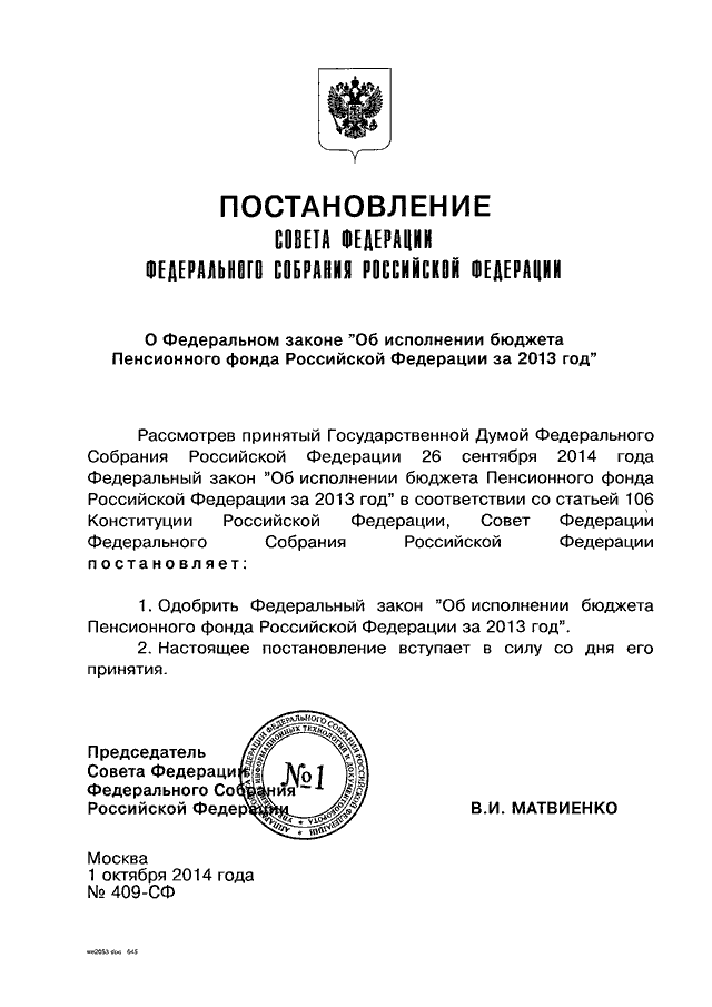ПОСТАНОВЛЕНИЕ СФ ФС РФ от 01.10.2014 N 409-СФ