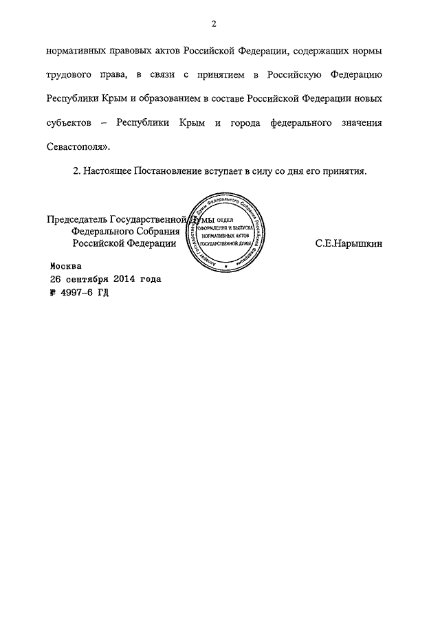 ПОСТАНОВЛЕНИЕ ГД ФС РФ от 26.09.2014 N 4997-6 ГД