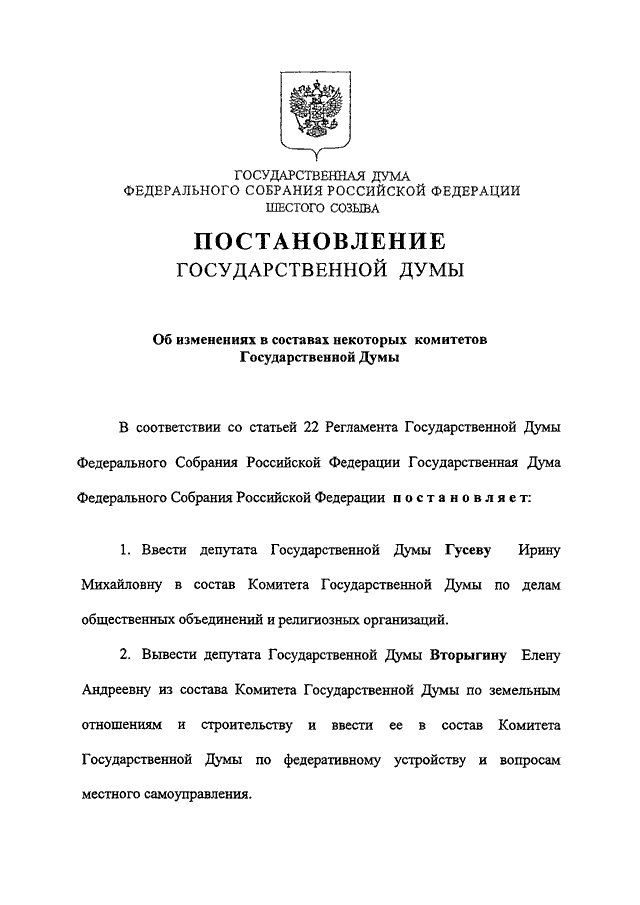 "ОБ ИЗМЕНЕНИЯХ В СОСТАВАХ НЕКОТОРЫХ КОМИТЕТОВ ГОСУДАРСТВЕННОЙ ДУМЫ"